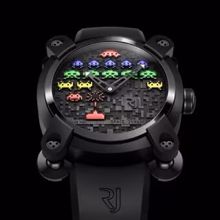 El artesano relojero Romain Jerome ha presentado un modelo exclusivo basado en el mítico juego 'Space Invaders'. El reloj, del que solamente se producirán dos series limitadas de 78 unidades, cuenta con un fondo en el que se puede ver el clásico diseño del juego que causó sensación en las máquinas recreativas de los 80. Los marcianos de 'Space Invaders' darán la hora a los privilegiados que consigan hacerse con este exclusivo reloj.