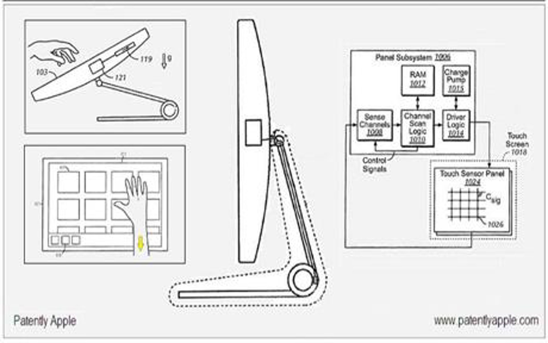 La patente, que fue presentada en enero, muestra los planes para un ordenador de escritorio iMac con una pantalla táctil. El soporte se movería arriba y abajo y, la pantalla, se podrá girar para convertirse en un dispositivo tipo 'tablet'.