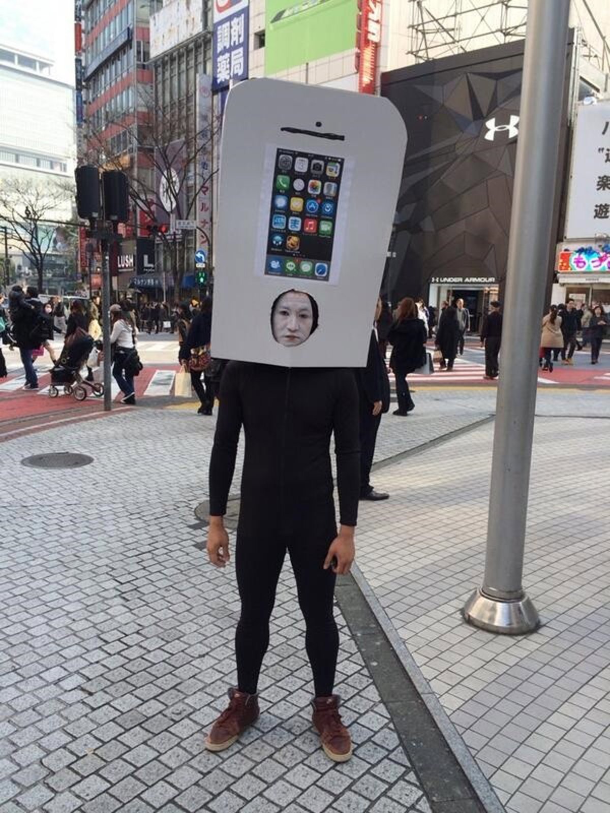 Yoppi espera la llegada del nuevo 'smartphone' de Apple vestido de iPhone, lo que le ha convertido en el centro de las miradas de todos aquellos que pasan por allí. Él lo está narrando en su cuenta de Twitter y en su blog personal, y no deja pasar la oportunidad de fotografiarse con todo aquél que se lo pide.