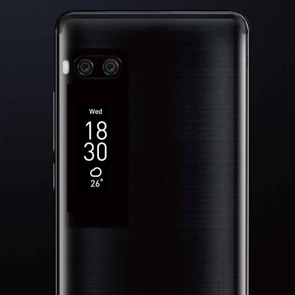 Esta pantalla trasera se encuentra en el lado izquierdo del dispositivo, debajo de la doble cámara. Para convertirlo en su seña de identidad, Meizu pondrá a la venta fundas específicamente diseñadas para el Pro 7 y Pro 7 Plus, que incluyen un hueco para que se pueda ver la información de la pantalla.