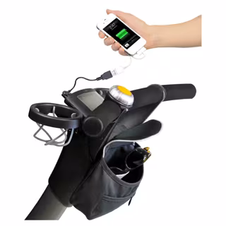 El carrito de bebé también cuenta con un generador de energía situado en las ruedas traseras que se recarga solo durante el paseo, o bien puede enchufarse a la red eléctrica. Esto hace posible que el móvil u otro dispositivo puedan cargarse durante el trayecto, tener encendidas las luces de doble intensidad dependiendo de si es de día o de noche y consultar datos en su pantalla digital.