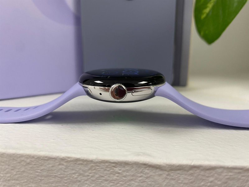 Este nuevo 'smartwatch' se ha lanzado en las versiones de 41 y 45 mm, y en Portaltic hemos podido probar durante varias semanas el de menor tamaño con carcasa plata pulida y una correa de silicona lila. A primera vista, su diseño continúa con las líneas de los modelos anteriores, con un cuerpo redondo y una corona que sobresale en el lateral derecho junto a un botón de acceso rápido.