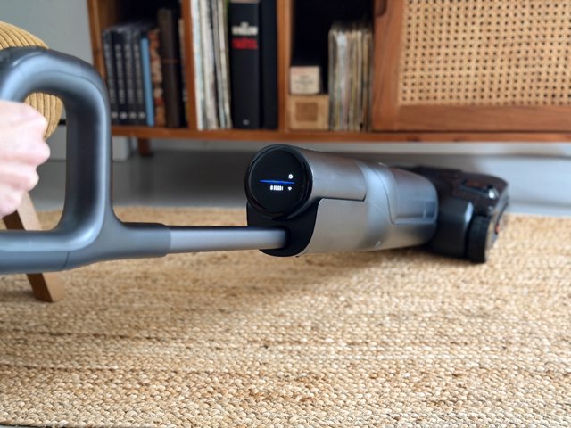 Durante estos días de prueba, también nos ha gustado especialmente la facilidad de uso global del aparato, un aspecto que influye mucho en la experiencia cotidiana de limpieza. Nos gusta especialmente su diseño, que permite que la aspiradora se incline hasta colocarse prácticamente perpendicular al suelo -180 grados- para acceder bajo casi cualquier mueble, alcanzando una altura mínima de apenas 12,5 cm en esa posición. A esto se le suma unas ruedas bien equilibradas que ayudan tanto al empuje como al giro, haciendo que el movimiento sea muy fluido.