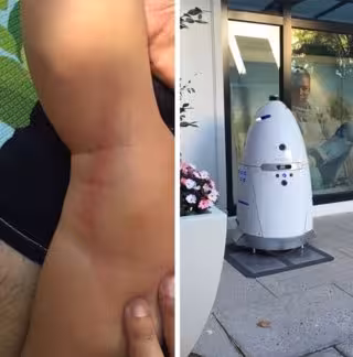 "El robot golpeó en la cabeza a mi hijo y cayó boca abajo en el suelo", comentó Tiffany Harwin, madre del bebé. En las fotografías difundidas a través de las redes sociales se puede ver la pierna magullada del niño. "Él estaba llorando como un loco y rara vez llora", terminó diciendo la madre.