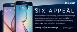 Además, la imagen incluye un texto que anuncia la posibilidad participar en un sorteo y obtener un dispositivo Galaxy S6 con solo registrarse, una oferta válida hasta el 26 de marzo.