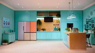 Samsung ha comenzado el 'tour privado' en la cocina, donde ha destacado su gama de electrodomésticos modulares y personalizables Bespoke. El frigorífico permite "tomar decisiones más sostenibles", como ha expuesto la compañía, ya no solo por su diseño, que puede adaptarse a cualquier situación o estilo, sino también porque cuenta con el certificado A+ de eficiencia energética.