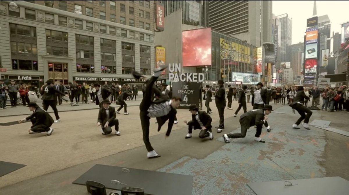 Los bailarines comienzan a salir de una caja formada por una serie de paneles en los que se puede leer 'Be ready 4 the next Galaxy', el eslogan que ha utilizado Samsung para el evento junto con las letras de 'Unpacked' en la parte superior. Con el número 4 a la espalda, los bailarines comienzan a salir del interior de la caja sorprendiendo a los transeúntes de Nueva York.
