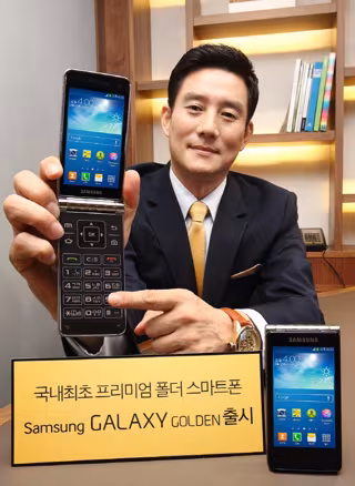 Samsung ha presentado un nuevo 'smartphone' con tapa y doble pantalla de 3,7 pulgadas, el Galaxy Golden. Este dispositivo contaría además con cámara de 8 megapíxeles, Android 4.2 Jelly Bean, procesador de doble núcleo de 1,7 GHz, un modo fácil para optimizar la pantalla de inicio y un podómetro con sistema S Health.