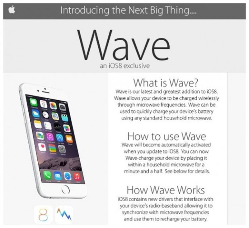"Ahora puedes 'wave-cargar' tu dispositivo metiéndolo en un microondas estándar durante un minuto y medio", rezaba el cartel, que explicaba que el funcionamiento de esta funcionalidad se basaba en que iOS 8 contenía "nuevos drivers" que sincronizarían la radio del terminal con la frecuencias microondas del electrodoméstico.