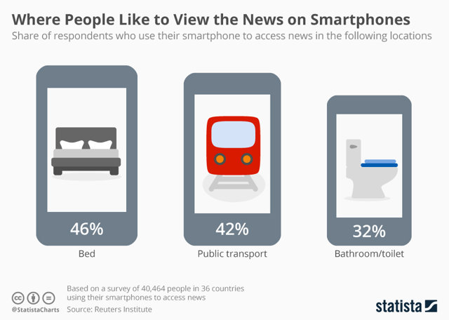 Por delante del baño se encuentran otros dos lugares también muy populares para consultar las noticias en el 'smartphone'. La cama es el lugar predilecto para este uso, pues un 46% de los usuarios afirma leer los medios con su móvil a la hora de levantarse o acostarse.