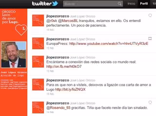José López Orozco, alcalde de Lugo y candidato del PSdG-PSOE,cuenta con más de 500 seguidores en Twitter. Una plataforma digital que utiliza habitualmente para comentar aspectos relacionados con su vida personal, profesional y política, a la vez que se comunica e interacciona con otros usuarios.