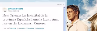 El cantante comentó en su cuenta la frase que aparece en los carteles que indican el nombre de las calles de la ciudad de Louisiana, escribiendo: "New Orleans fue la capital de la provincia Española llamada Luis y Ana, hoy en dia Lousiana... Curioso".