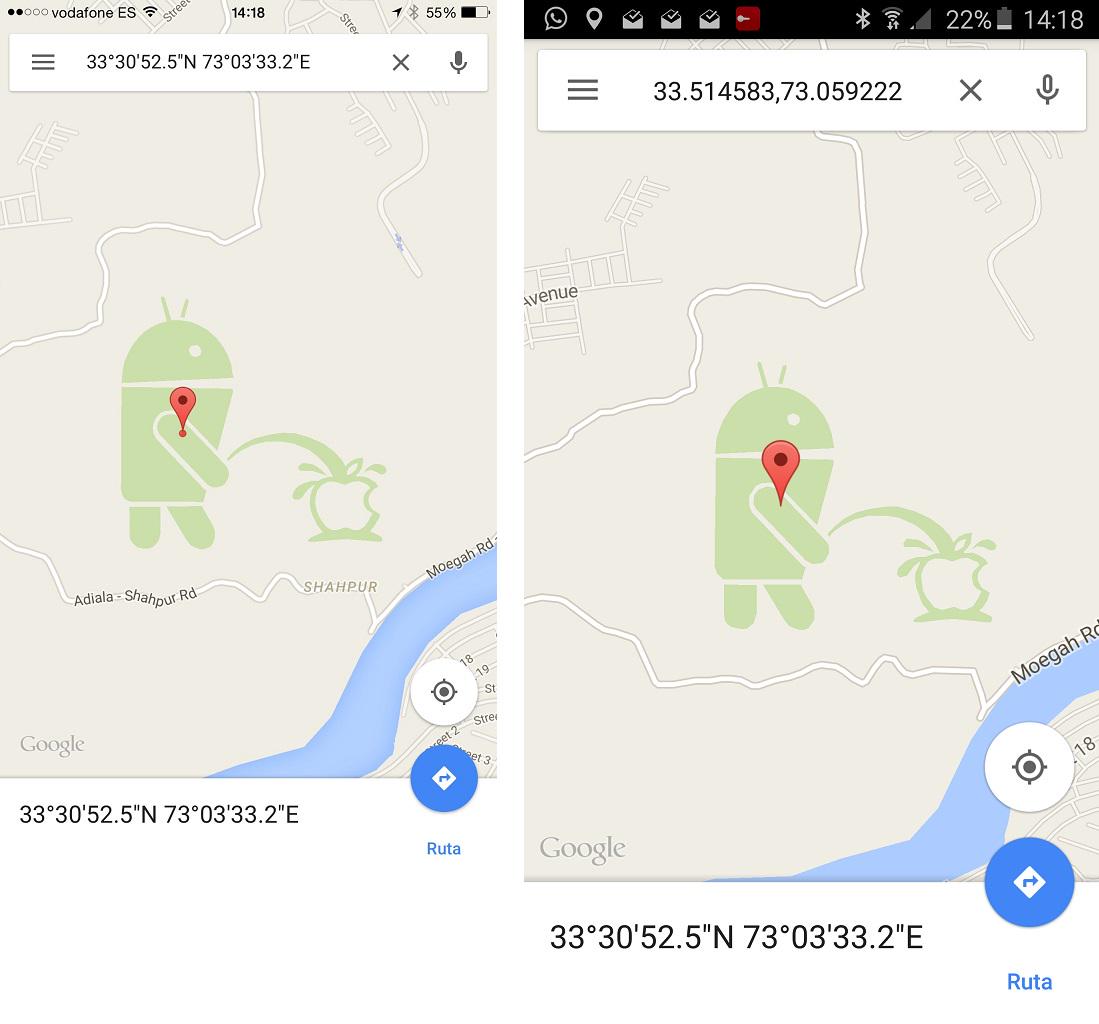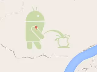 La compañía del buscador ha incorporado una curiosa imagen en unas coordenadas concretas de su servicio de cartografía. Se trata de nada más y nada menos que la mascota robot del sistema operativo móvil de Google haciendo pis, meando, orinando, miccionando, aliviándose... ¡Sobre el logotipo de Apple!