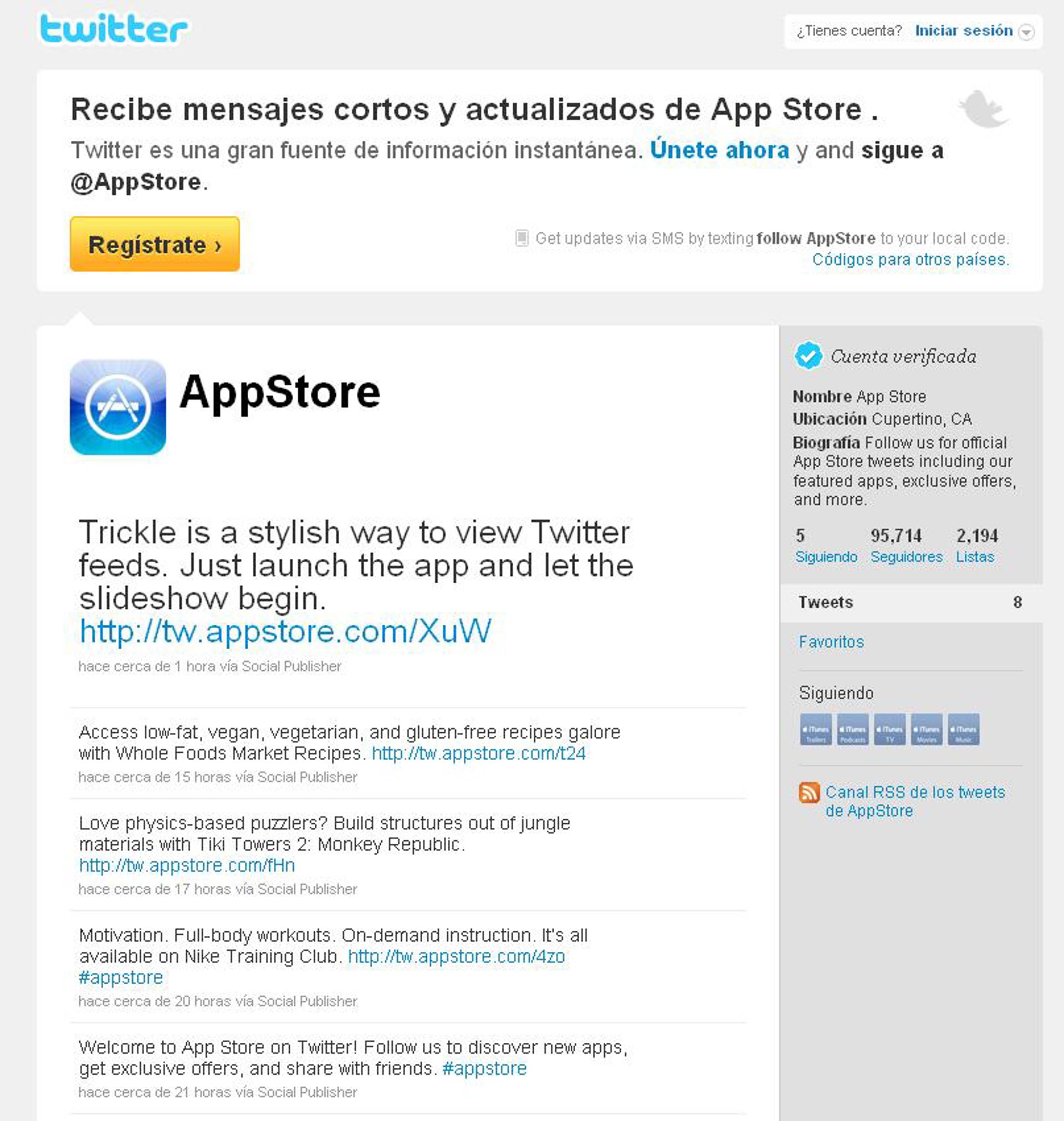 La App Store de la compañía Apple se ha integrado hace tan sólo unas horas en la red social de 'microblogging' Twitter y ya ha conseguido alrededor de 95.000 seguidores del perfil (@AppStore). También se ha integrado en Facebook, aunque en esta red social lleva funcionando desde el 6 de enero y en apenas 20 días, ya ha logrado que casi 950.000 personas hayan pinchado el botón de "me gusta".