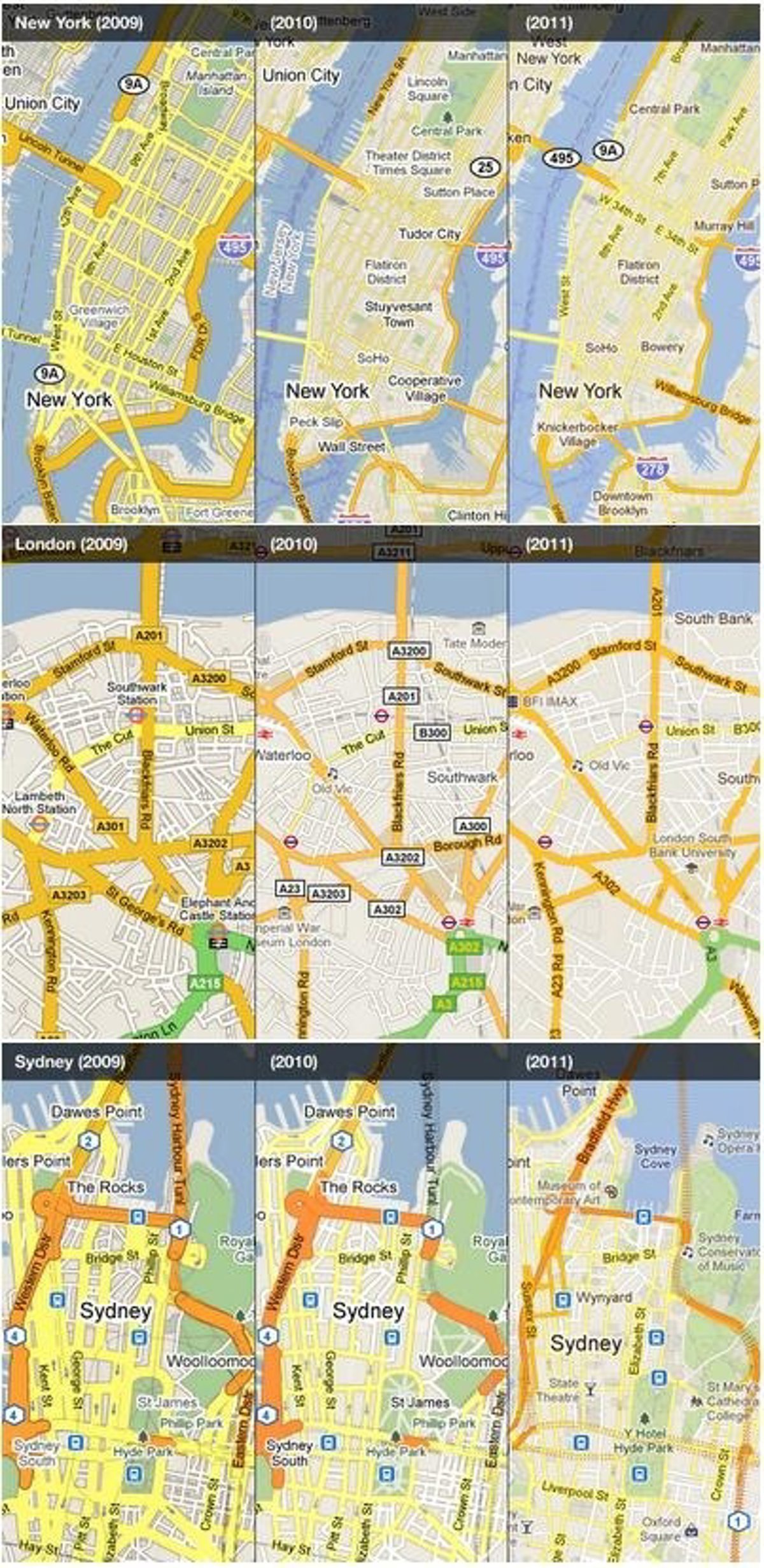 En las imágenes publicadas por Google, que representan el mismo mapa de New York, Londres y Sydney, se pueden apreciar todas esas novedades, entre las que destaca el cambio de los colores. También se ha mejorado en la legibilidad de la información escrita referente a nombres de ciudades, calles y carreteras, que en conjunto logra el objetivo de Google, facilitar la navegación de los usuarios.