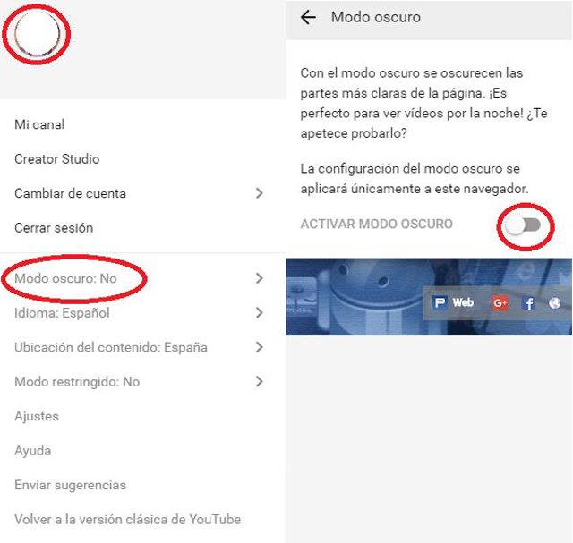 Tu último paso es activar la opción, ya que ahora sí que tendrás una herramienta en tu cuenta para ello. En la parte superior derecha de la ventana de YouTube aparece tu fotografía de perfil; pulsa en ella y haz clic en ‘Modo oscuro’ para habilitar el botón. Cuando te canses, tan solo tendrás que volver a ese ajuste y deshabilitarlo. Podrás activarlo y desactivarlo todas las veces que quieras. Si utilizas varios navegadores o cuentas, recuerda seguir estos pasos en todos.