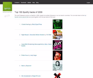 En cuarto, quinto y sexto puesto se sitúan Lady Gaga y Beyoncé, con sus respectivos temas 'Poker Face' y 'Halo', y Kings Of Leon, gracias a 'Use Somebody'. Black Eyed Peas vuelven de nuevo a la lista de Spotify con su éxito 'Boom Boom Pow' en séptima posición, por delante de 'Ayo Technology', de Milow; 'When Love Takes Over', de Kelly Rowland y David Guetta; y 'Kids' (MGMT).