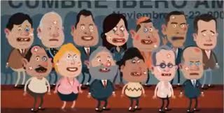 Chávez y el presidente boliviano, Evo Morales, los dos mayores críticos de Estados Unidos en Sudamérica, se dan un banquete con una águila calva americana, mientras que el Rey de España asa en un fuego a la líder chilena Michelle Bachelet.