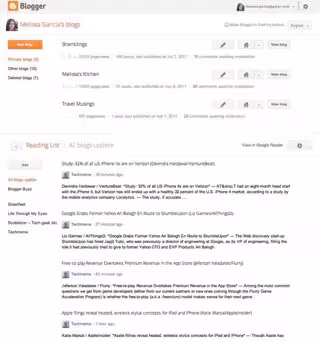 Google ha llevado este nuevo diseño también a las opciones de edición de los blogs de Blogger. La información se presenta de forma similar a la de Gmail, con una lista de las entradas en vez de mails y opciones de edición en una columna a la izquierda como ocurre con las bandejas del servicio de mensajería.