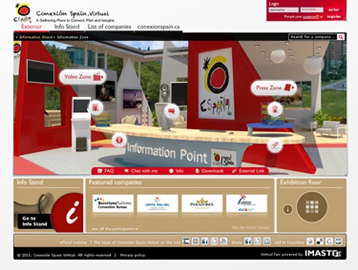 Conexión Spain virtual pretende ser un punto de encuentro de empresas e instituciones españolas como Patronato de Turismo Costa del Sol, Paradores de Turismo, Promo Madrid, Turismo Valencia Convention Bureau y Turisme de Barcelona Convention Bureau, AC Hoteles, entre otras.
