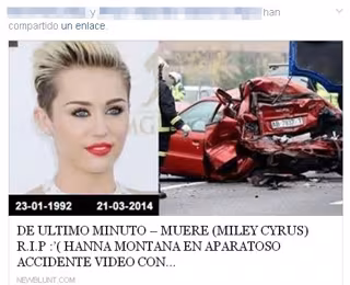 Una noticia falsa sobre la muerte de la cantante Miley Cyrus ha sido utilizada en una nueva campaña de ciberdelincuentes en las redes sociales. En concreto, se anuncia la muerte de la cantante en un accidente de tráfico con el objetivo de engañar a los usuarios y redirigir su navegación.