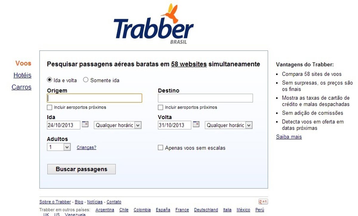 Trabber.com.br funciona como un buscador de los vuelos en todos los portales de venta de viajes on line y el cliente selecciona donde comprarlo. Trabber.cm.br lleva la competencia de precios a los mercados donde opera para beneficiar a los viajeros.