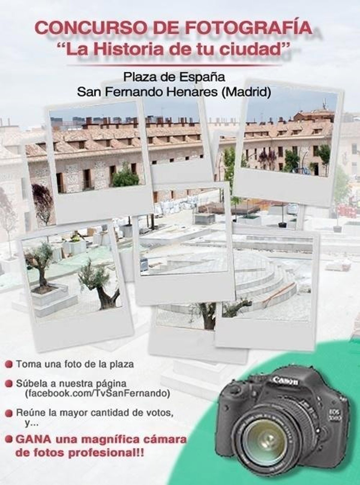 El I Concurso de Fotografía online 'La Historia de tu ciudad' que se realizará a través de la plataforma 'Facebook', se celebrará desde hoy viernes 20 de mayo hasta finales del mes, y consistirá en conseguir la mejor imagen de la Plaza de España de San Fernando de Henares.