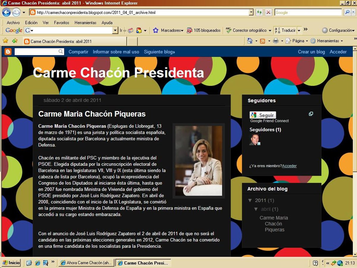 El primer texto del blog, tras un currículum que ocupa dos párrafos, acaba con una explícita frase: 'Con el anuncio de José Luis Rodríguez Zapatero el 2 de abril de 2011 de que no será el candidato en las próximas elecciones generales en 2012, Carme Chacón se ha convertido en una firme candidata de los socialistas para la Presidencia'.