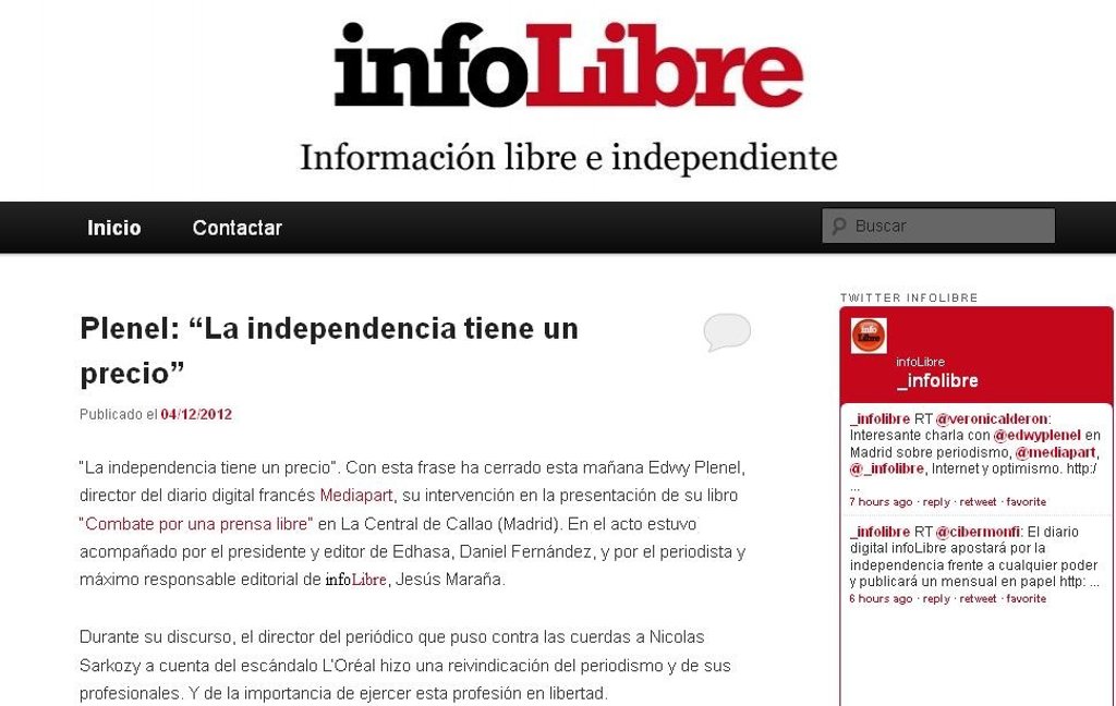 El exdirector del periódico francés 'Le Monde' y fundador del diario digital de pago 'Mediapart', Edwy Plenel, ha subrayado este martes que 'Infolibre' --impulsado por periodistas de 'Público', RTVE y 'El País'-- va a compartir su apuesta por "la independencia" del periodismo frente a cualquier poder y que ambos van a tener informaciones en común.