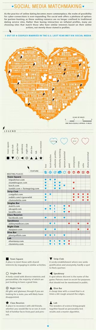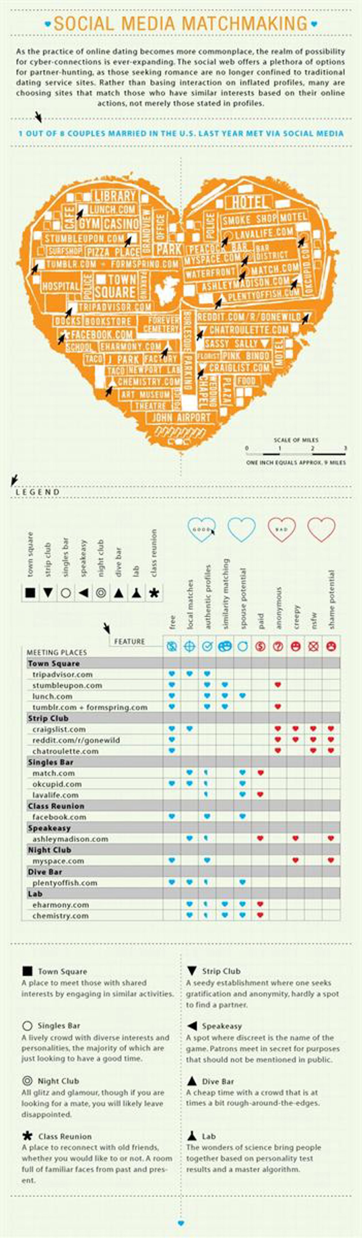 La infografía cuenta con dos columnas. En la primera se clasifica a los sitios web como si se tratase de lugares físicos en función de su orientación. Mientras que Facebook lo comparan como una reunión de ex-alumnos, Match.com tendría la categoría de bar de solteros, MySpace una discoteca o Chatroulette, directamente, un club de 'striptease'.