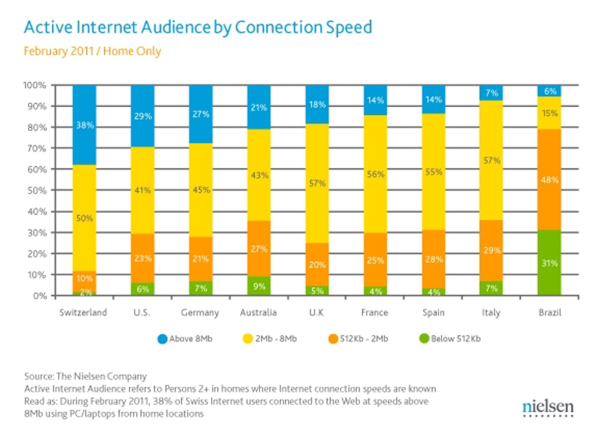 España se mantiene a la cola entre los países desarrollados en cuanto a velocidad punta de conexión a Internet. Según Nielsen Online, España se sitúa a la cola, sólo por delante de Italia y Brasil, de los países con conexión "súper rápida", con sólo un 14% de los usuarios con conexiones por encima de los 8Mb.