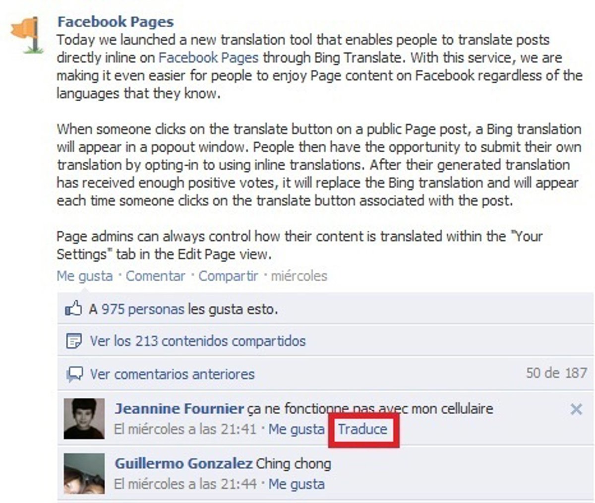 De esta forma, al lado de el 'Me gusta' en los comentarios de los usuarios en cualquier contenido de las páginas aparecerá el botón 'Traducir'. Al pulsarlo, automáticamente el texto aparecerá traducido en el idioma en el que el internauta tenga configurado Facebook. Así, si originalmente su creador lo introdujo en inglés o francés, un hispanohablante podrá leerlo en español.