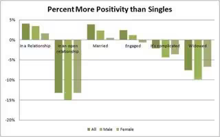 Las personas que están en una relación o casados parecen ser más felices que aquellos que no lo están. Y dentro de este grupo aquellos que están en una relación parecen menos felices en comparación con los casados. Las personas casadas, sin embargo, tienden a tener mayor edad que los solteros y según Facebook, los resultados de otros estudios apuntan a que con la edad, la personas tienden a ser más felices.
