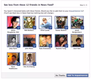 Como se puede ver en la foto, Facebook avisaría diciendo: "¿quieres ver menos sobre estas personas en Últimas noticias?". Avisando al usuario de que no ha interactuado con esas personas últimamente, y que mejor pase a la lista de conocidos.