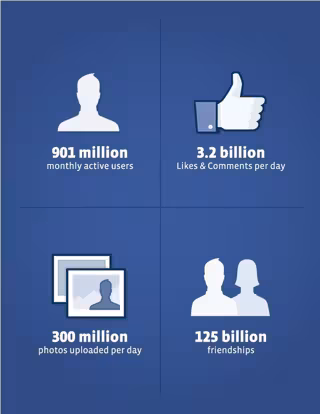 El documento también informa de otras cifras, como el número de "me gusta" y de comentarios al día, que se encuentra ya en 3.200 millones. Diariamente, se suben 300 millones de fotos a esta red social, y hay un total de 125.000 millones de amistades.
