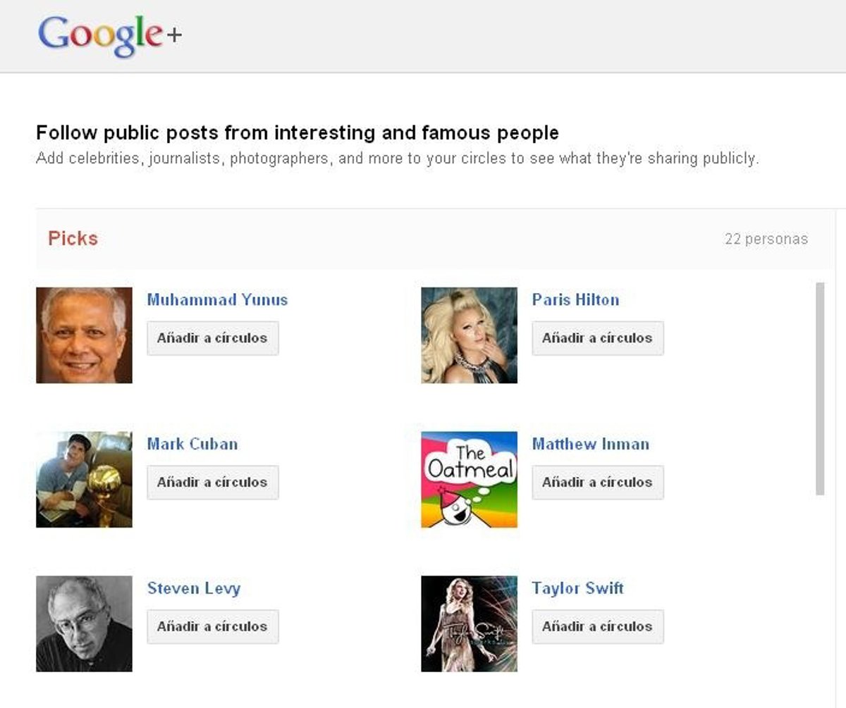 La red social Google+ empezó la semana pasada a añadir sus denominadas listas de 'Usuarios sugeridos'. Estas listas aparecen en los perfiles de los usuarios y sugieren a ciertas 'celebrities' o personajes famosos para que los usuarios les añadan a sus círculos de amigos. Bajo el lema "Sigue las publicaciones de personas interesantes y famosas. Añade 'celebrities', periodistas, fotógrafos y más personas a tus círculos para ver lo que comparten", Google propone perfiles de gente famosa a los que seguir.