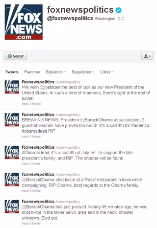 La cuenta de Twitter del canal Fox News ha sido utilizada para distribuir la noticia falsa de la muerte de Obama, precisamente el día de la festividad del 4 de julio. Se desconoce quién es el responsable pero se han publicado varios 'tuits' en los que se informaba de que el presidente de Estados Unidos había sido asesinado de dos disparos durante un acto de su campaña electoral. En lo 'tuits' se hacía mención a la cuenta oficial de Twitter de Barak Obama por lo que los comentarios han tenido una gran difusión.