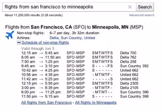 La primera es la consulta de vuelos y rutas. Introduciendo un origen y un destino, el buscador muestra una lista con los vuelos y compañías que efectúan esa ruta aérea. Además de esa información, se muestra una lista de los próximos vuelos que efectuarán salida con esos parámetros. En la información que se muestra como resultado de la búsqueda, Google también incluye el tiempo estimado del trayecto entre los dos puntos.