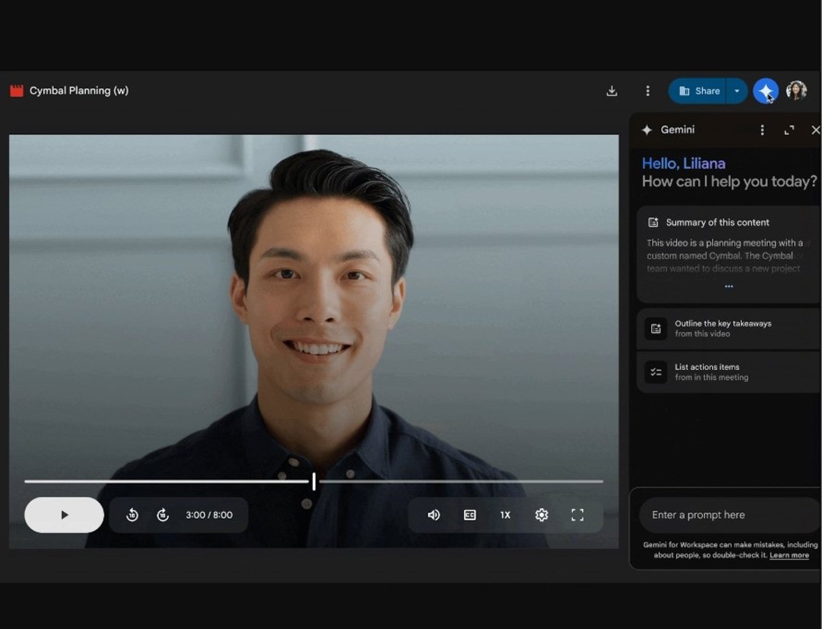 En concreto, Google ha ampliado las capacidades de resumen y preguntas de Gemini a los vídeos que estén almacenados en Google Drive, por lo que esta nueva función en formato de 'chatbot' conversacional ofrecerá una síntesis del contenido del vídeo y responderá preguntas acerca del mismo.