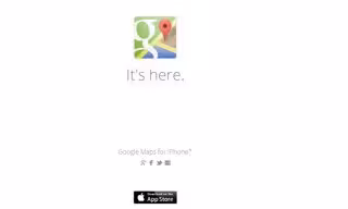 En dicha web solo aparece el icono de la aplicación con la respuesta a la pregunta, "está aquí". En la parte inferior, además de botones para compartir la web en redes sociales, hay un enlace a iTunes, desde donde se puede descargar la aplicación. Se trata de una curiosa web de promoción, que demuestra el interés de Google por ver Google Maps de nuevo como el servicio de cartografía líder en iOS.