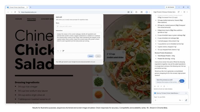 Para que estas indicaciones queden registradas en Chrome, los usuarios deben abrir el chat de Gemini en una barra lateral del navegador e indicar una orden. Tras responder, aparecerá un botón con la opción de "guardar el 'prompt' como una 'skill'", y guardar. Si se pulsa en guardar, se abrirá una pequeña ventana dentro del navegador para añadir un nombre a la 'skill', y editar la instrucción. Una vez se haya rellenado la ventana, aparecerá el mensaje de "'skill' guardada".