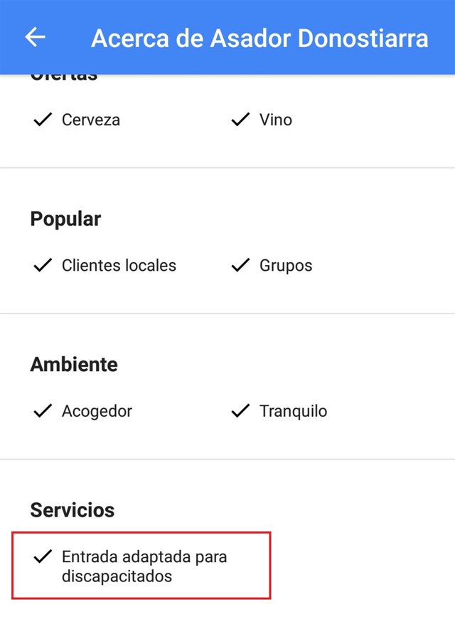 Al buscar cualquier local en Google Maps, como un comercio, un restaurante o un teatro, y pinchar sobre el resultado, bajo el nombre y la descripción aparece una serie de adjetivos, que despliegan, a su vez, un menú de características más amplio.