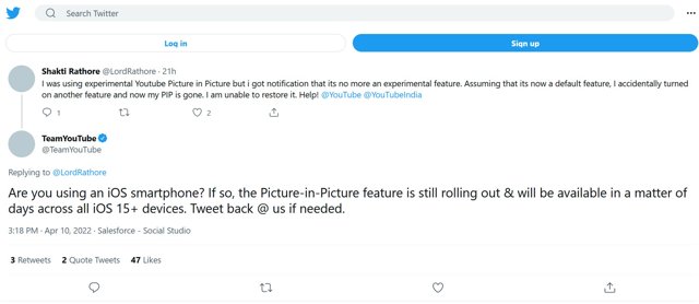"¿Usas un smartphone iOS? Entonces, la característica 'Imagen dentro de imagen' se está distribuyendo y estará disponible en cuestión de días para todos los dispostiviso iOS 15+", fue la respuesta de la cuenta oficial de YouTube, origen de la confusión.