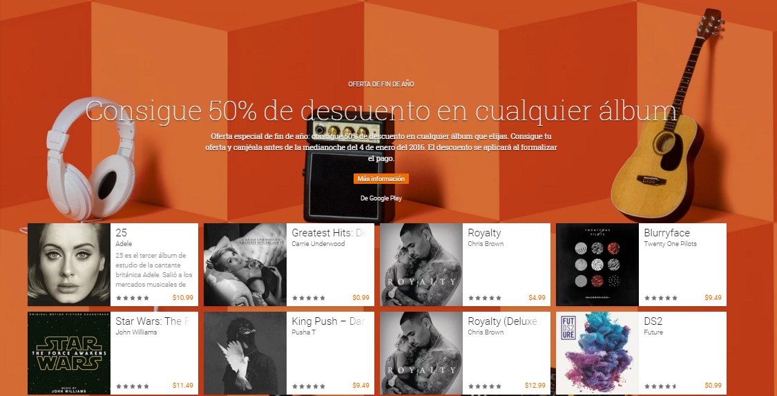 Cualquier álbum, cualquiera, tiene el 50 por ciento de descuento, ¡a mitad de precio! Esta rebaja también estará en vigor hasta la medianoche 4 de enero de 2016. Para poder disfrutar de ella deberás pinchar en este link para activar un cupón especial de descuento, de forma que cada vez realices un pago, la rebaja se aplicará en el momento.