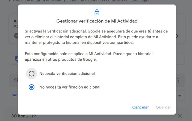 La actividad almacenada ahora se puede proteger gracias a un paso de verificación adicional que se puede solicitar pinchando en un botón dentro de 'Mi Actividad' que dice 'Gestionar verificación de Mi Actividad'. Tras ello, se puede indicar la opción 'Necesita verificación adicional' para que al acceder a la información se pida la contraseña de Google -como si se iniciara sesión en la cuenta-.