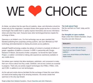 Apple prohibió la reproducción bajo Flash en todos sus dispositivos, argumentando que el 'software' de vídeo más usado en el mundo no es apta para sus aparatos dado el alto consumo de batería que requiere. En cambio, sí se ha posicionado claramente a favor de vídeo escrito en lenguaje HTML5.