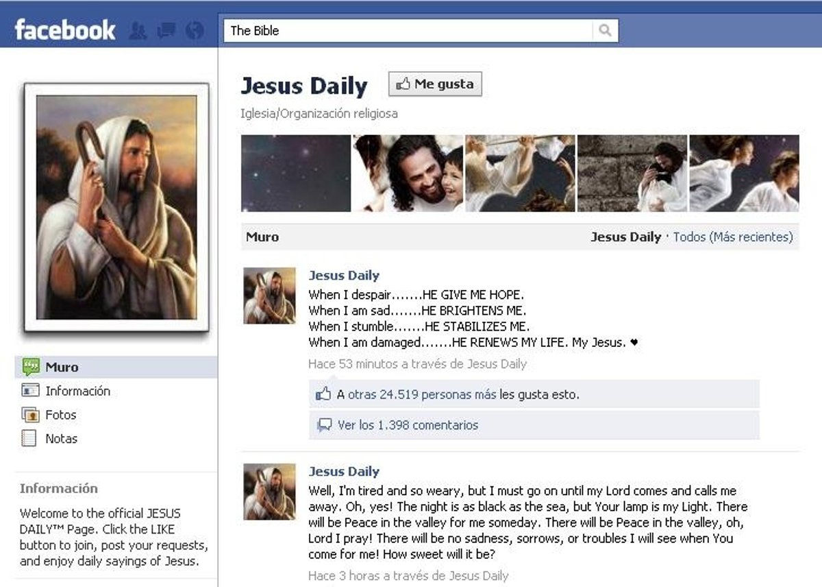 Teniendo en cuenta que una de las últimas publicaciones realizada en la página de 'Jesus Daily' consiguió en tan solo 47 minutos 20.168 'Me gusta' y 1.181 comentarios, es lógico que se haya situado en la primera posición del ránking. Esta página fue creada en el año 2009 para "difundir el Evangelio de Cristo", tal y como asegura su creador en la propia página.
