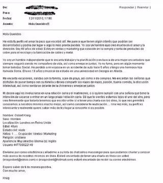 Eso sí, el gancho ahora no es una foto exuberante, ni promesas eróticas. En este caso, se ofrecen como pareja estable destacando sus atributos de hombre ideal: "responsable, con ingresos estables, romántico, divertido, respetable padre de familia, con formación e idiomas, lamentablemente viudo y ávido de cariño".