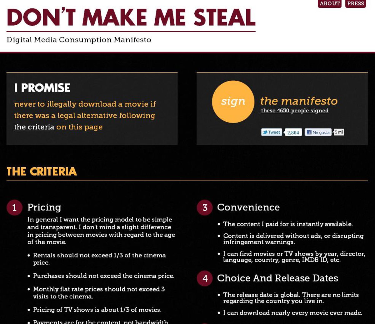 Un grupo de internautas suizos ha hecho público un manifiesto bajo el lema 'Don't make me steal' ('No me dejes que robe') (http://www.dontmakemesteal.com/), con el objetivo de que las personas que firmen las bases se comprometan a no descargar contenidos sin autorización, siempre y cuando exista un servicio oficial con las características que exponen.