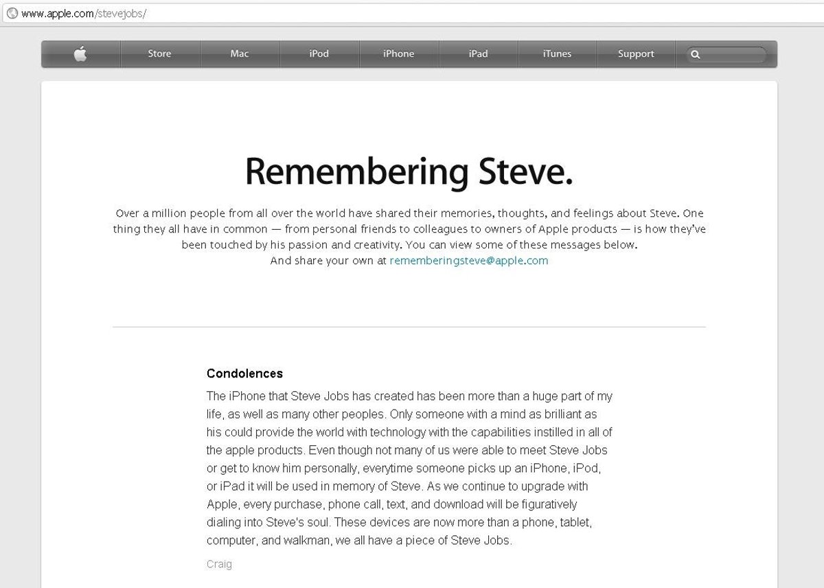 Tras la muerte del cofundador de Apple, la compañía registró una cuenta de correo para que los usuarios pudiesen enviar sus mensajes sobre Jobs. La compañía creo la página de homenaje para difundir la dirección de correo y rendir tributo a su antiguo CEO. Desde el 5 de octubre, fecha de la muerte de Jobs, la página ha mostrado un escueto mensaje en memoria del fallecido, pero la compañía ha decidido actualizar la página.